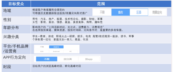 結合廣告主產品的用戶屬性(如年齡、地域、性別、時間段等)來設置,從而提升效果達成轉化。
