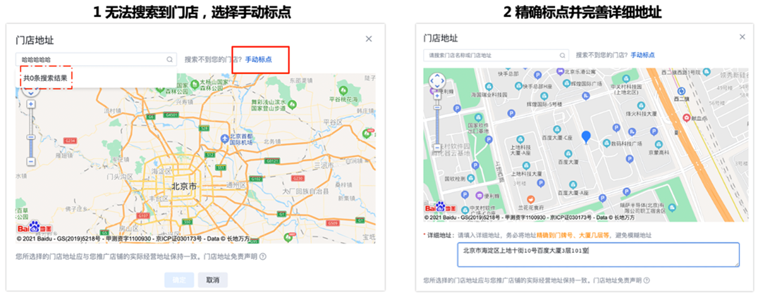 - 功能說明:當商家通過搜索地址找不到自己的門店時,可通過手動標點輸入詳細門店地址,來完成門店入駐