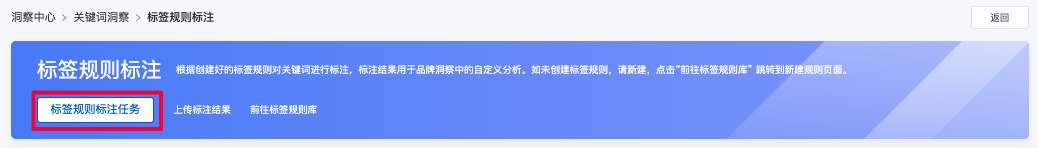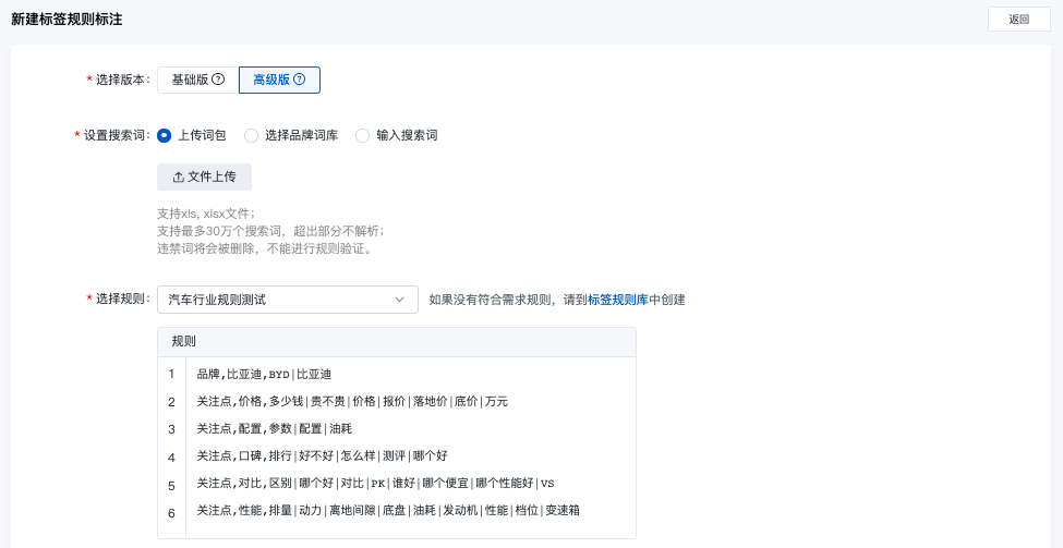- 標簽規則標注任務,在線定義關鍵詞的標簽規則,系統自動為關鍵詞打標簽
