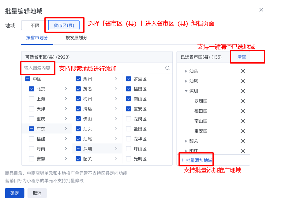 批量修改地域支持設置省市區(縣)-信息流推廣