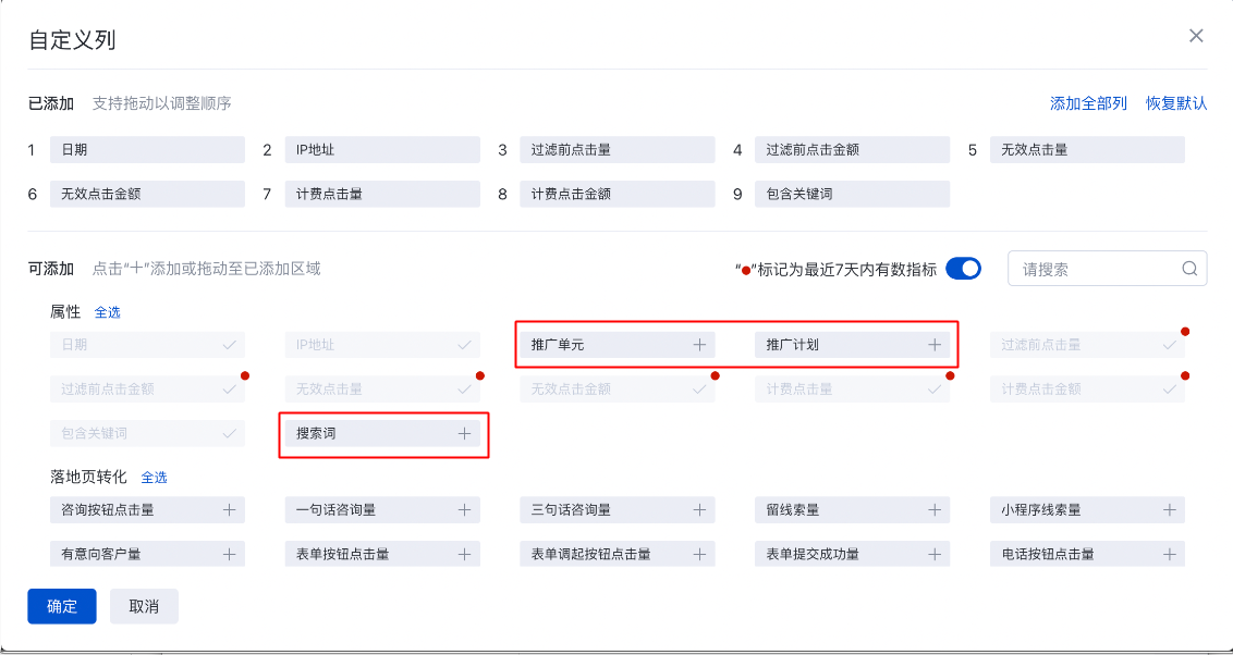 1.1新增搜索詞維度,并支持查看全部類型的轉化指標,可在自定義列中調取: