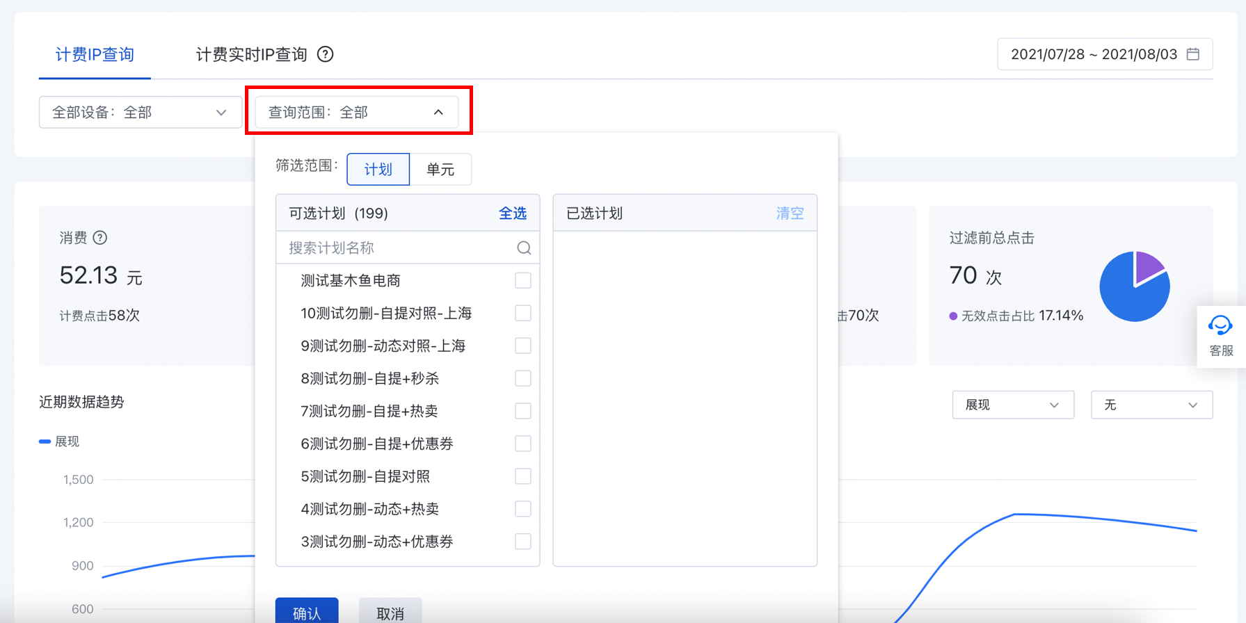 可通過點擊“計費IP查詢”下的“查詢范圍”來進一步篩選計劃和單元: