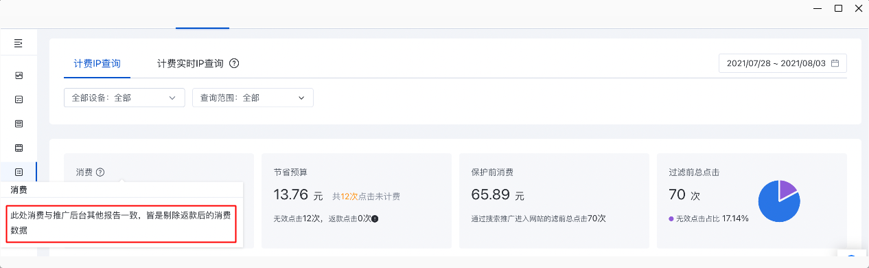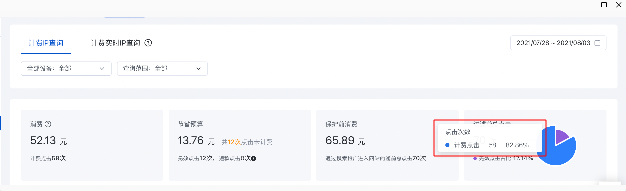 1.4“點擊情況分布”餅圖表述升級:分別呈現無效點擊、無效點擊占過濾前總點擊占比,以及計費點擊、計費點擊占過濾前總點擊占比: