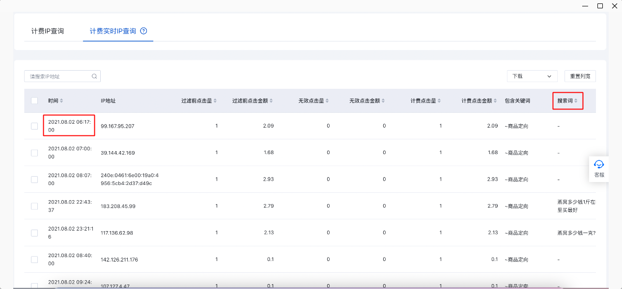2. 計費實時IP查詢頁面:提供秒級數據查看,并同樣支持搜索詞維度的數據查看: