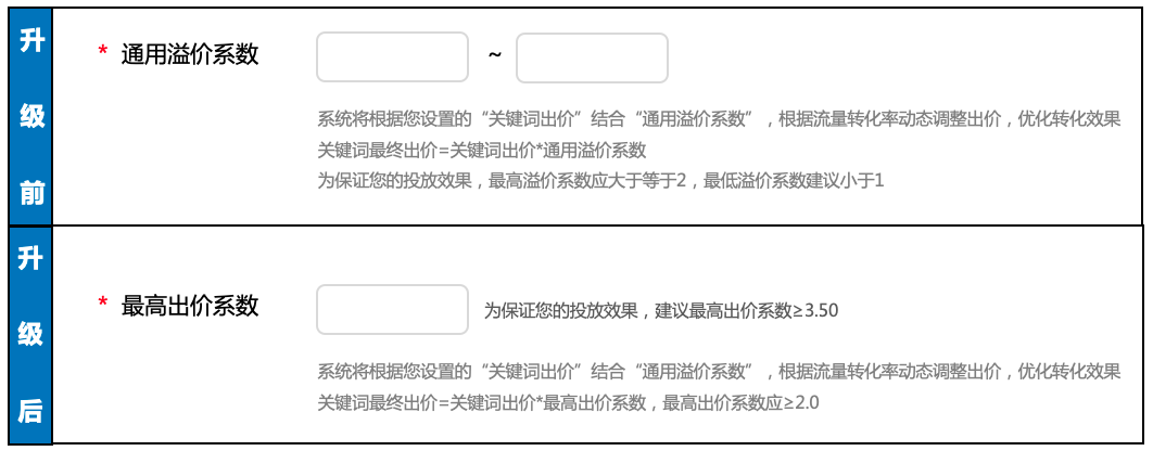 (1)升級點1:【通用溢價系數】改為【最高出價系數】,不再展示eCPC溢價系數下限,不用再設置eCPC溢價下限;