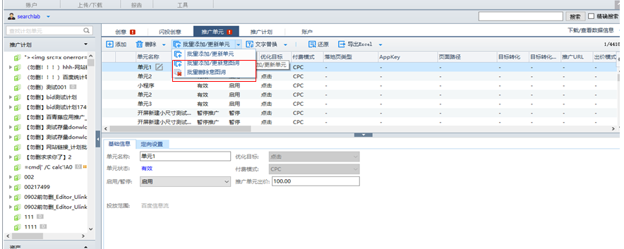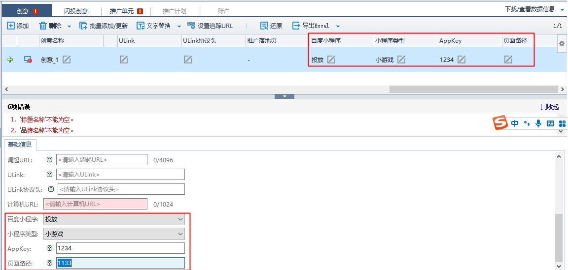 1)、功能入口:信息流推廣客戶端-推廣單元—優化目標為轉化,落地頁類型選擇百度小程序,輸入APPkey、頁面路徑。支持多創意批量修改。