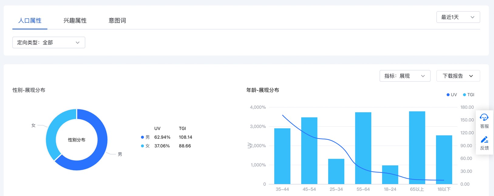 為了幫助廣告主從用戶流量視角查看定向受眾效果,通過用戶畫像方式讓廣告主清晰了解其廣告投放的受眾,信息流專項報告新增定向受眾報告,通過UV占及TGI 數據指標,快速定位高意向人群,讓廣告主在洞察投后行為的情況下,提升廣告投放效率與效果!