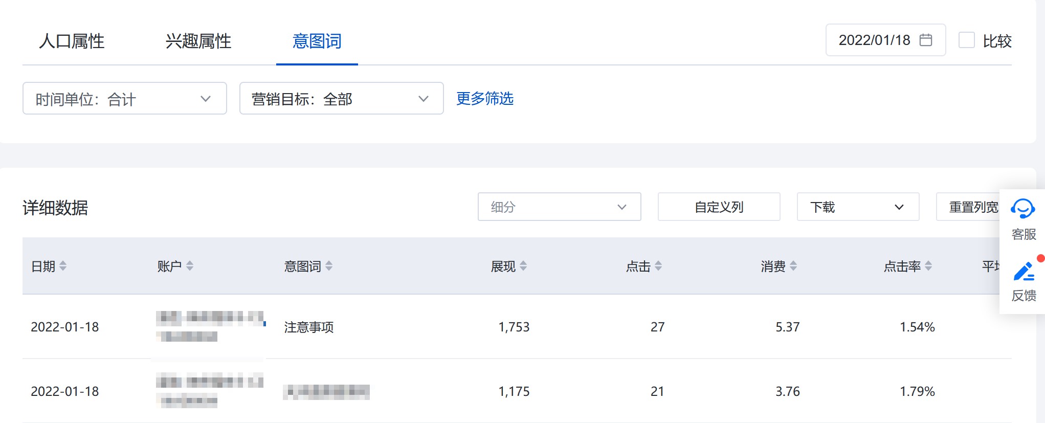 2.2.3 意圖詞:如下圖所示,頁面功能分區與其它報告一致,包括篩選區、詳細數據區。