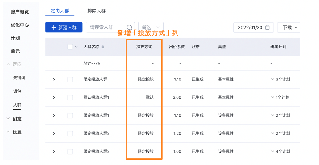 升級點2: 人群投放管理列表新增“投放方式”列:支持查看當(dāng)前人群設(shè)定的投放方式