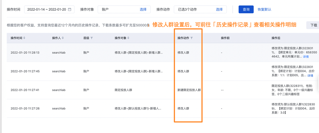 升級點3: 歷史操作記錄-人群操作記錄同步升級:修改人群設(shè)置后,可在歷史操作記錄中查看與下載