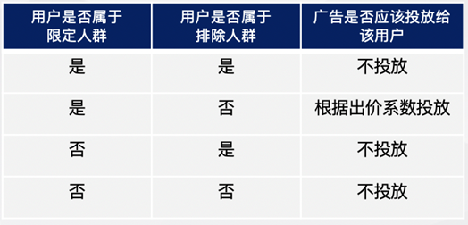 當(dāng)計劃同時綁定了限定人群和排除人群時,廣告投放規(guī)則如下:
