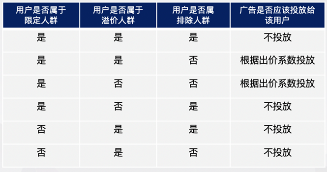 當(dāng)計劃同時綁定了限定人群,溢價人群和排除人群時,廣告投放規(guī)則如下: