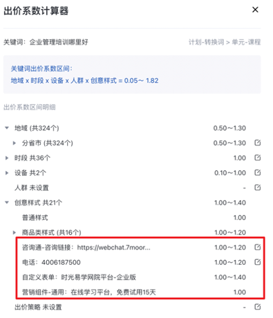 3、搜索推廣投放平臺(www2.baidu.com)-出價系數計算器中將不再展示營銷類組件的出價系數(見下圖示意)