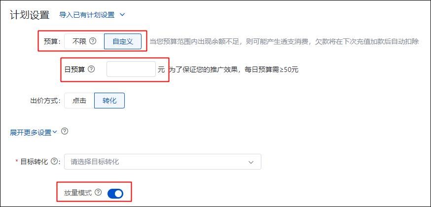 請(qǐng)注意:開(kāi)啟放量模式,需明確設(shè)置計(jì)劃的預(yù)算(見(jiàn)下圖),預(yù)算設(shè)置不能太低,以便系統(tǒng)快速學(xué)習(xí)放量。