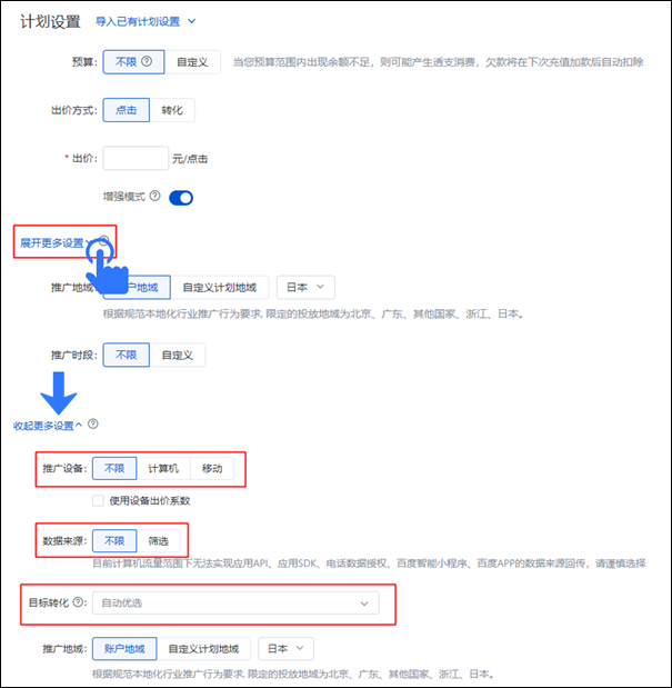 2.1 計(jì)劃設(shè)置中,預(yù)算設(shè)置的位置上移,且原“優(yōu)化目標(biāo)”更名為“出價(jià)方式”,降低理解難度: