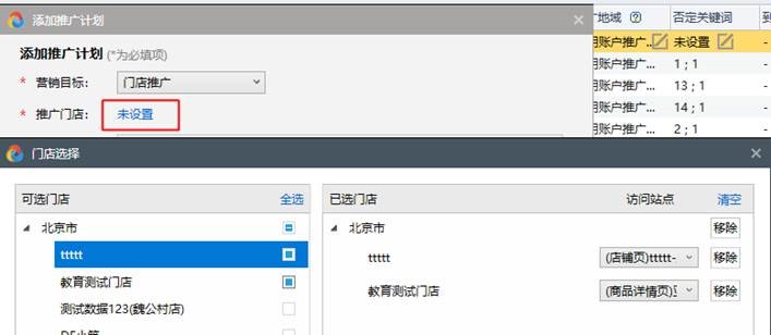 第二步:設置“推廣門店”,彈框顯示可選門店,選擇門店