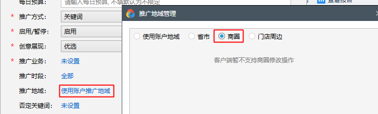 A3.百度營銷客戶端本次暫不支持商圈定向功能,無法編輯和查看具體的商圈。如您在web設置商圈,在百度營銷客戶端可以看到你選擇“商圈“選項,但是無法查看到具體選擇的商圈,如果您需要編輯此功能,請前往web端。