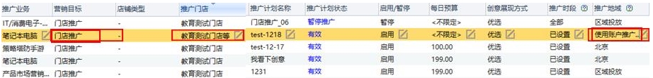 計劃層級-編輯門店計劃:可在列表區(qū)和編輯區(qū)查看、編輯推廣地域、推廣門店;列表區(qū)營銷目標一列可查看、篩選“門店計列表區(qū)