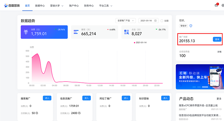 示例圖1-入口說明:推廣后臺(tái)-右側(cè)賬戶信息-推廣余額-查詢