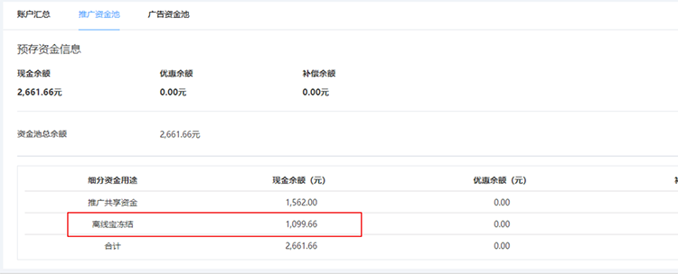 示例圖2:推廣資金池-離線寶凍結(jié)-查看具體余額,點(diǎn)擊跳轉(zhuǎn)