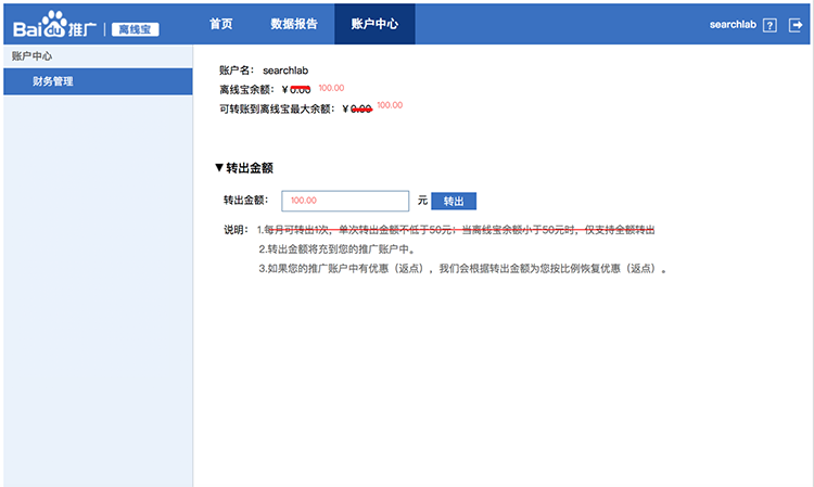 下線后未操作的賬戶會(huì)將離線寶內(nèi)的余額自動(dòng)返還至該賬戶的推廣余額內(nèi)