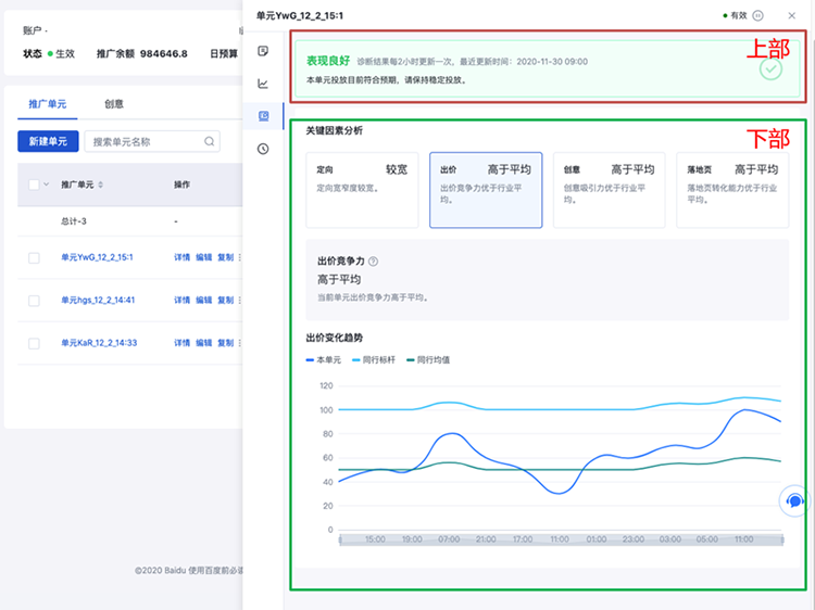 2.1診斷面板分區說明:診斷面板分為上下兩部分。上部展現當前單元整體診斷結果,快速呈現單元概要診斷信息;下部展現當前單元的關鍵因素分析,常駐4類診斷摘要卡片,分別是定向、出價、創意、落地頁,披露該物料層級的數據變化趨勢: