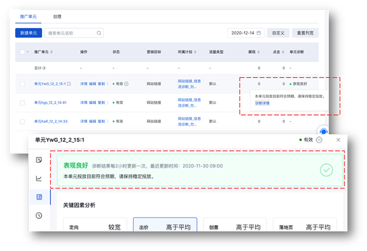 入口2:推廣單元列表-自定義列-添加 “單元診斷”指標 ,客戶可直接在推廣單元列表內,查看單元診斷狀態,點擊“診斷詳情”可調起診斷面版。
