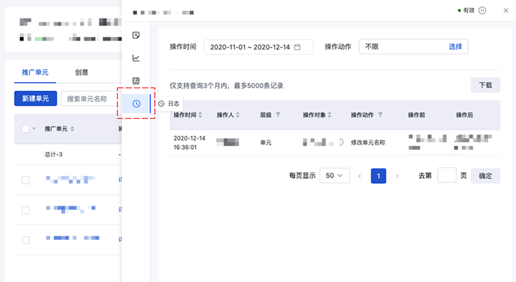 1.產品入口:推廣計劃/推廣單元層級-操作列-詳情-日志