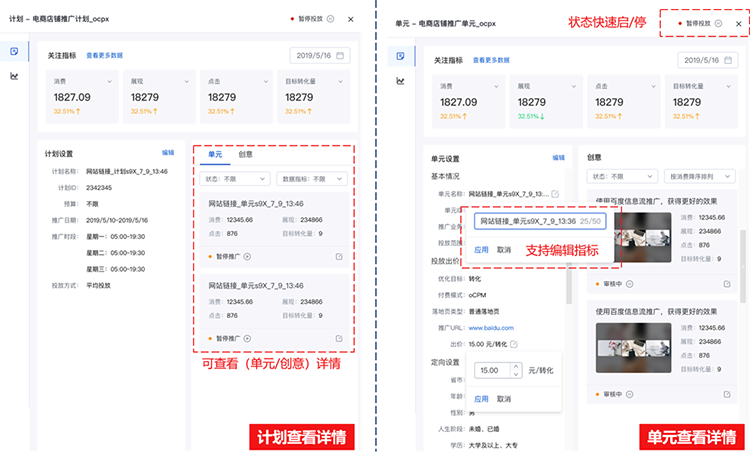在上述背景下,信息流推廣-診斷優化項目一期完成了在計劃&單元層級上線【詳情】功能,協助客戶快速查看計劃/單元重點指標配置和相應數據。