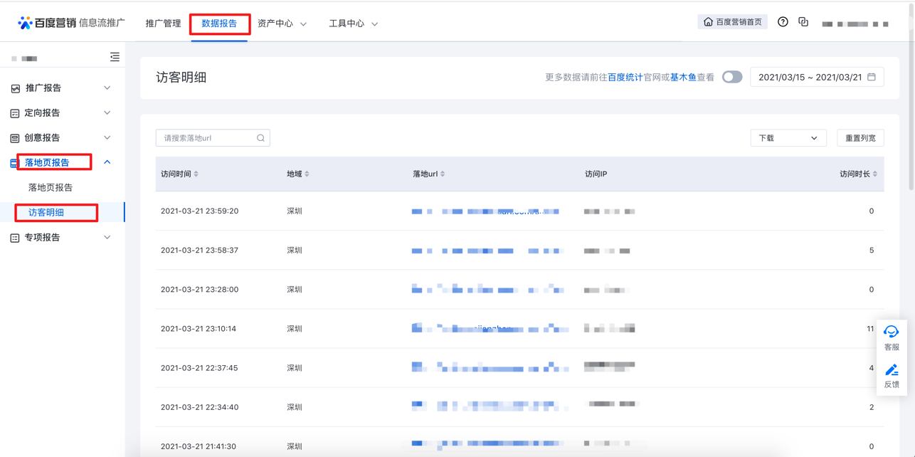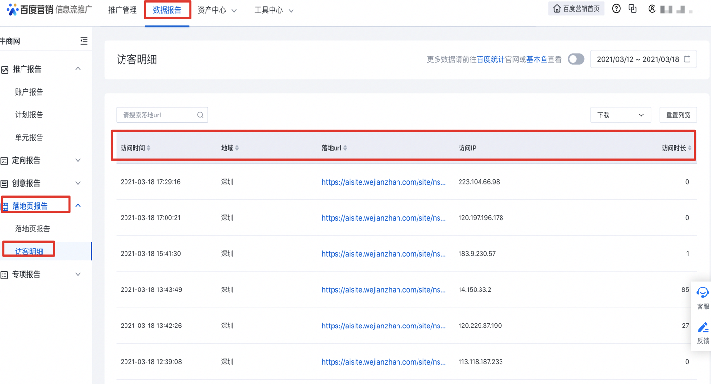 ③入口:信息流推廣平臺 → 數據報告 → 落地頁報告→訪客明細