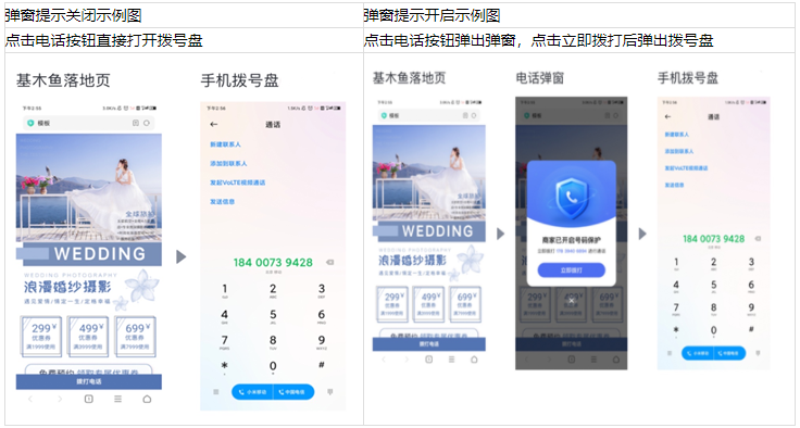 ①功能介紹:若客戶使用了智能電話產品,且開通電話彈窗功能,則當網民在搜索前卡和基木魚落地頁內點擊智能電話按鈕時,將顯示告知彈窗,點擊立即撥打可繼續撥號。